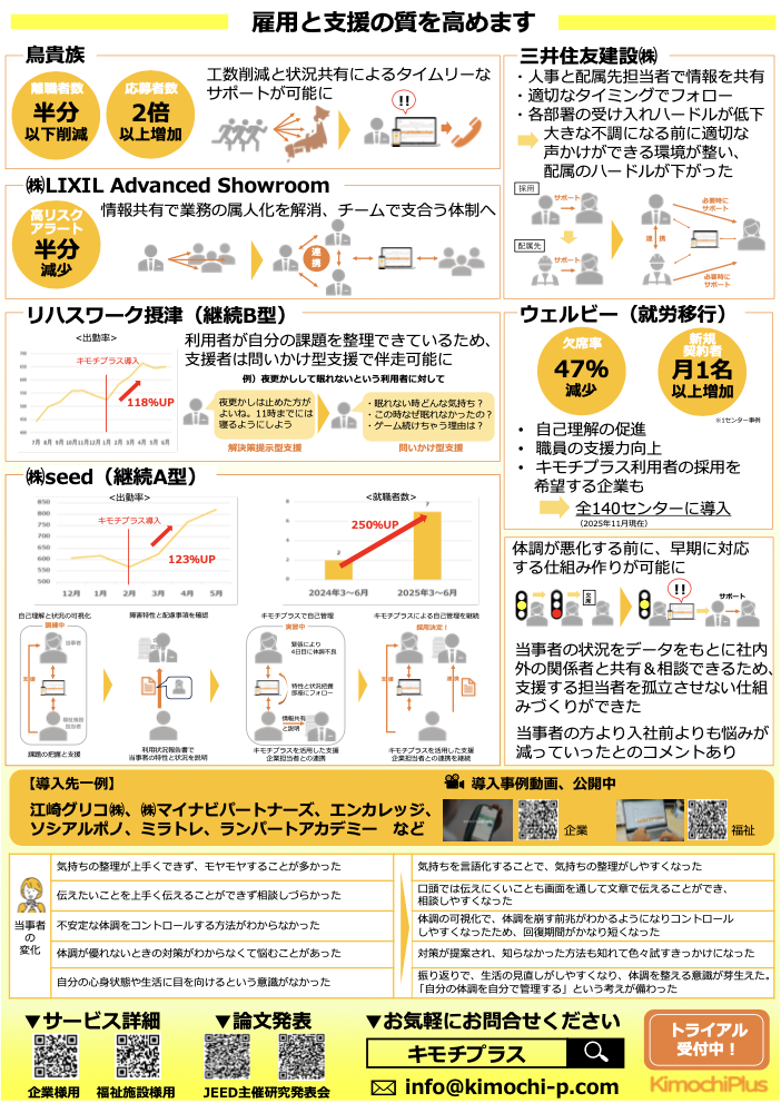 2025年12月20日・21日に東京ビッグサイトで開催された「就労支援フォーラムNIPPON2025」において、「キモチプラス」の機能および活用事例をご紹介するパネル展示を行いました。